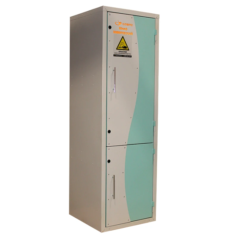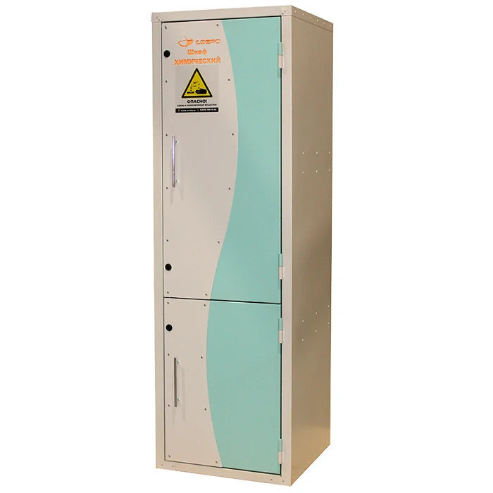 - Химический шкаф имеет современный дизайн и удобен в использовании: его не нужно крепить к полу или стене, для компенсации неровностей поверхности в комплектацию входят скрытые регулируемые опоры (0-60 мм), а дверцы оснащены магнитными фиксаторами.