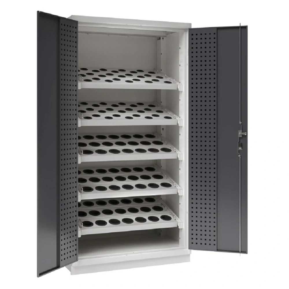 - Двери имеют усиливающие профильные рёбра с внутренней части, на рёбрах имеется перфорация в виде квадратных отверстий 12х12 мм и шагом 38 мм. Каждая дверь устанавливается на корпус шкафа при помощи трёх петель с открыванием на 180 гр. Замок двери имеет секретность 2000 комбинаций.