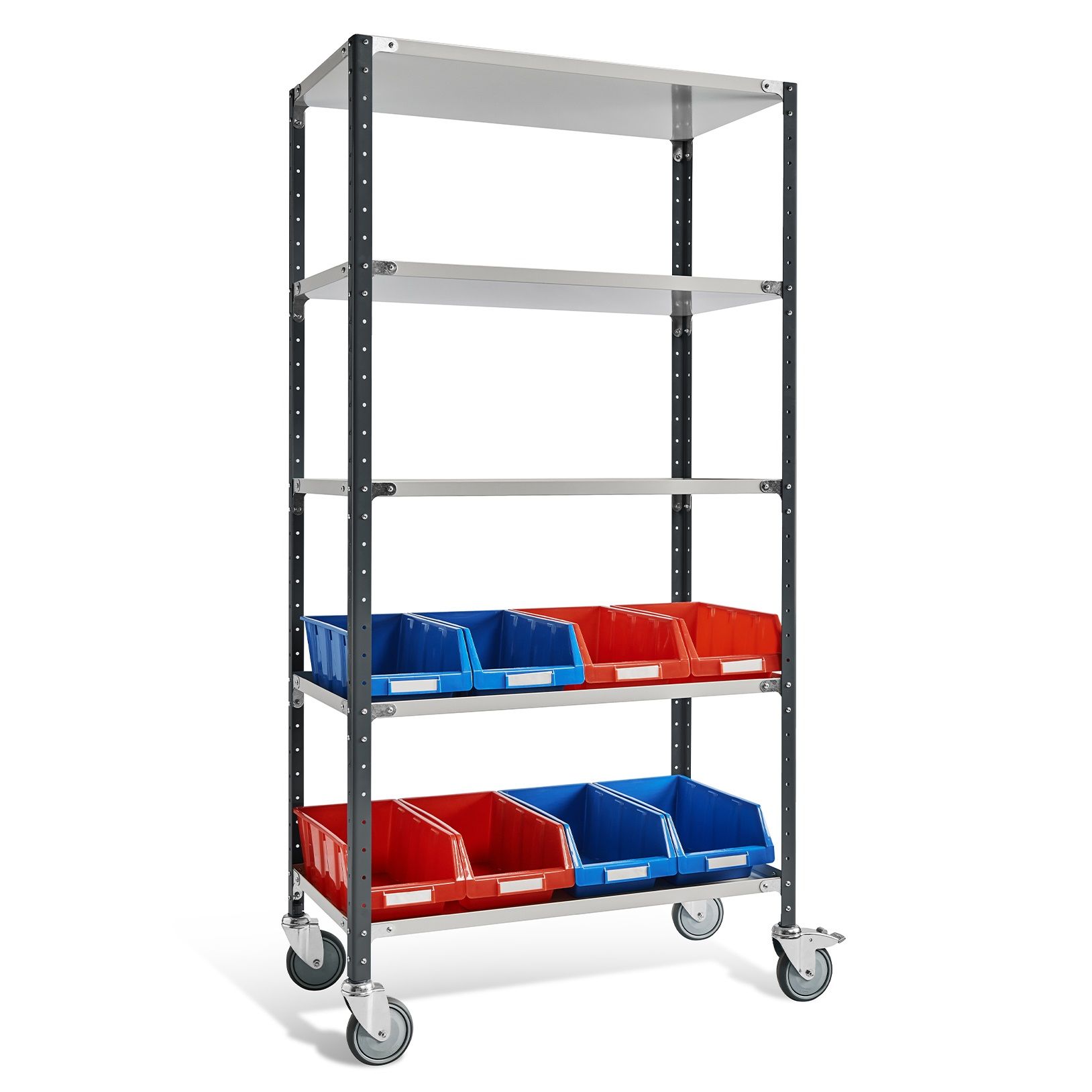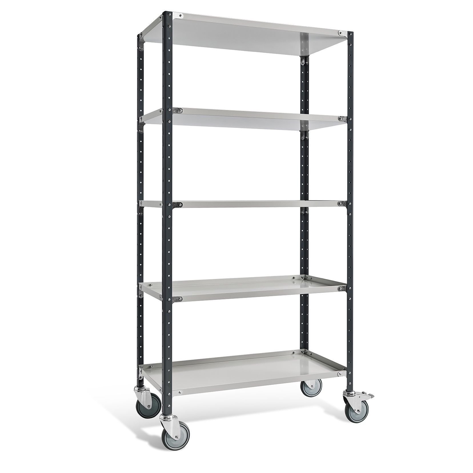 - Комплектация- пять полок с отбортовкой, четыре поворотных колеса (два с тормозом)