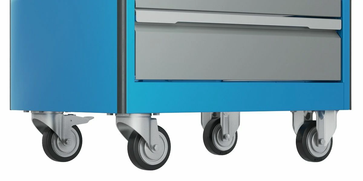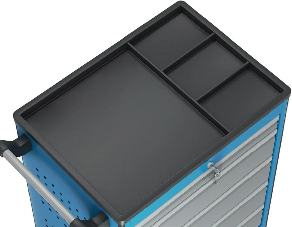 - Тележка оснащена системой антиопрокидывания новой конструкции, которая блокирует открывание ящиков, если один из них уже выдвинут. Это препятствует смещению центра тяжести и предотвращает опрокидывание тележки.