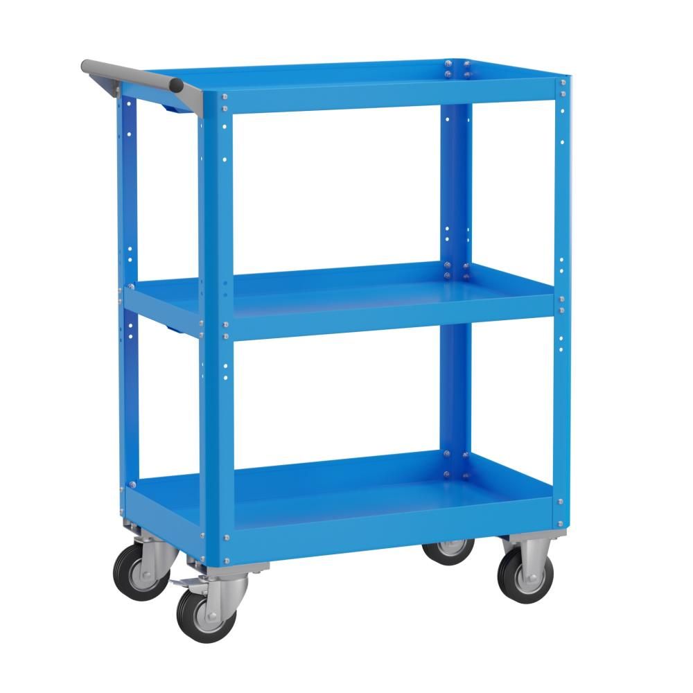 Инструментальная тележка серии PLACE 9507.0 с тремя полками открытого типа, предназначена для хранения и перемещения различных предметов, вещей, инструментов, оснастки т.д., используется для организации рабочего места в производственных помещениях, автосервисах и гаражных мастерских. Корпус выполнен из листовой стали толщиной от 0,6 до 1,5мм., покрыт полимерной порошковой краской. Верхняя и средняя полка имеют высоту борта 40мм., нижняя полка имеет высоту борта 60мм