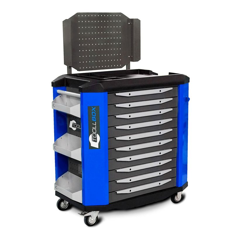 - В заднюю стенку тележки встроен складной перфорированный экран, на который легко устанавливаются различные полки, держатели и крючки для инструмента (плоскогубцев, ключей, отверток, электроинструментов и т.п.)