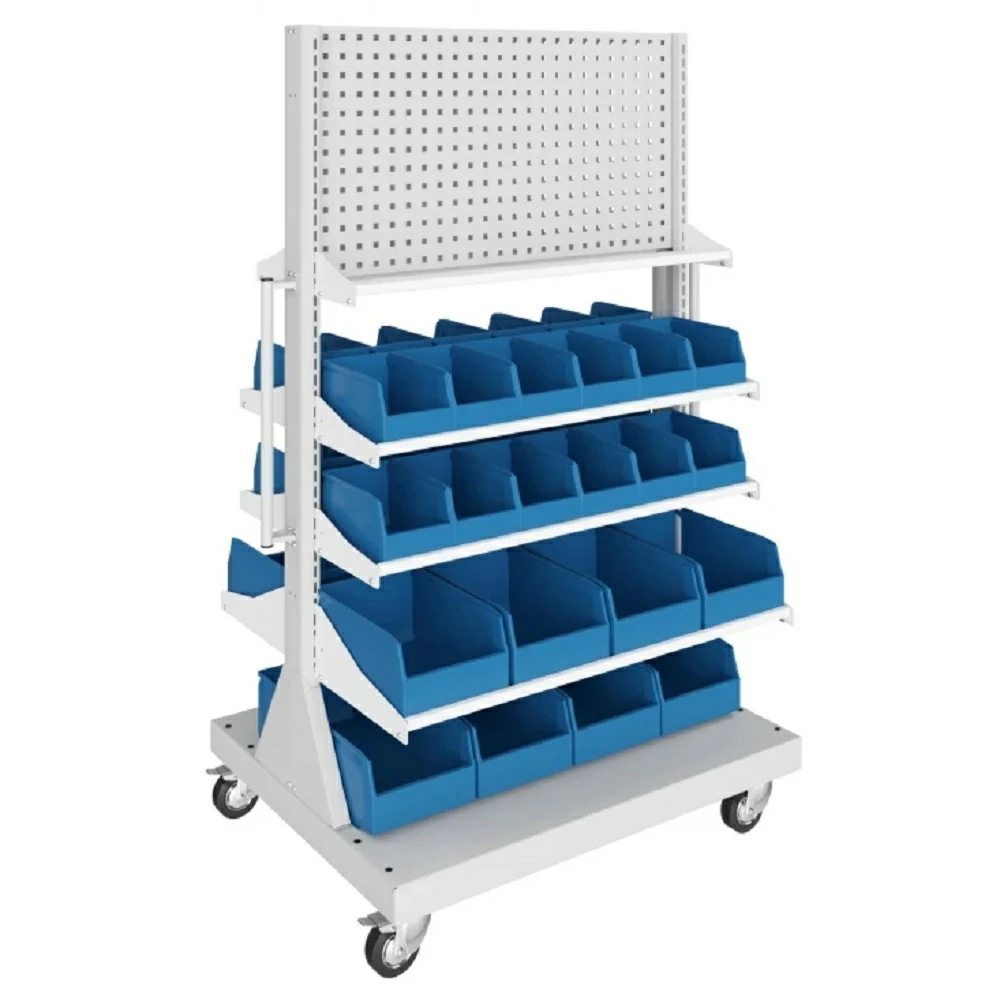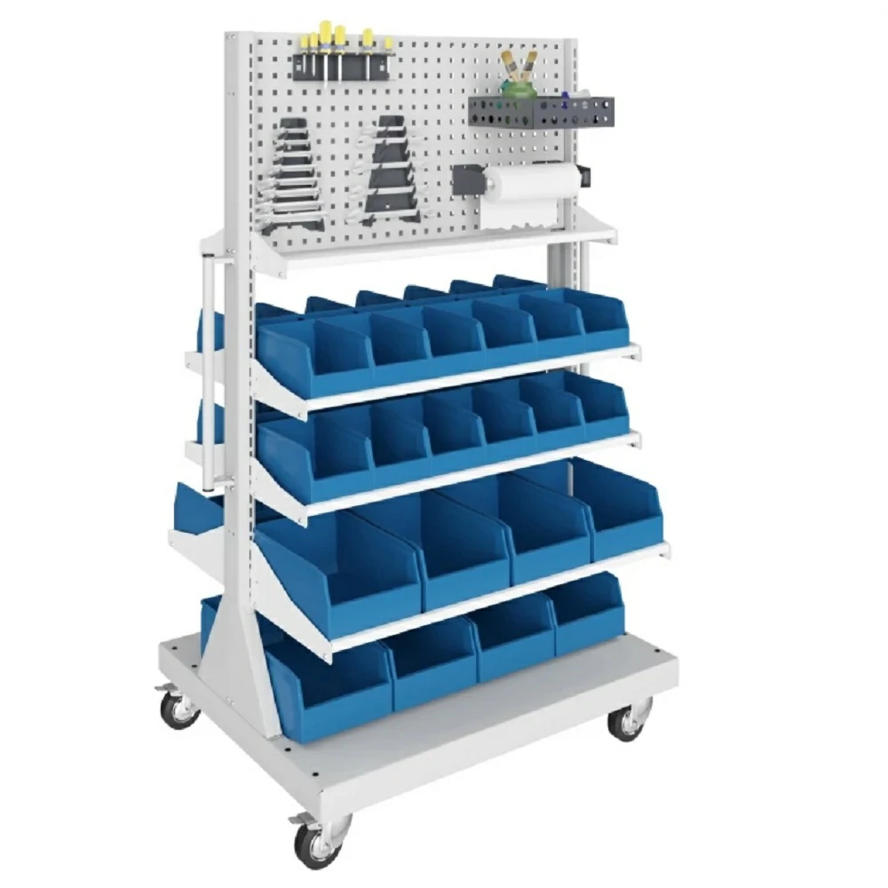 - Большие пластиковые контейнеры размещаются на 4 ярусах мобильной стойки. На нижнем ярусе кассетницы размещены 4 контейнера размером 150х225х500 мм. На 2 ярусе размещаются 4 контейнера размерами 150х225х500 мм.Контейнеры устанавливаются на полки SP 403 с допустимой нагрузкой до 50 кг. На 3 и 4 ярусах размещаются 24 контейнера размером 130х150х250мм - по 6 контейнеров на одной стороне каждого яруса. Контейнеры устанавливаются на полки SP 402 с допустимой нагрузкой до 40 кг.)
