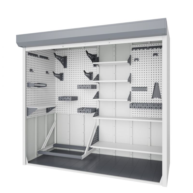 Односекционный роллетный шкаф 2300х1850х1200 предназначен для хранения различных вещей и инструмента, устанавливается в крытых помещениях, паркингах или под навесом на прочную поверхность (бетонная или деревянная поверхность). Шкаф представляет собой сборно-разборную конструкцию, состоящую из набора панелей и комплекта рольставней, которые соединяются между собой при помощи винтового соединения с внутренней части шкафа.