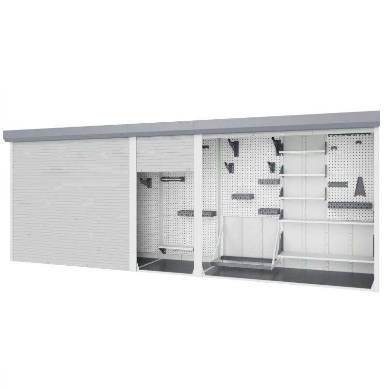 Шкаф представляет собой модульную систему хранения с тремя независимыми роллетными блоками.