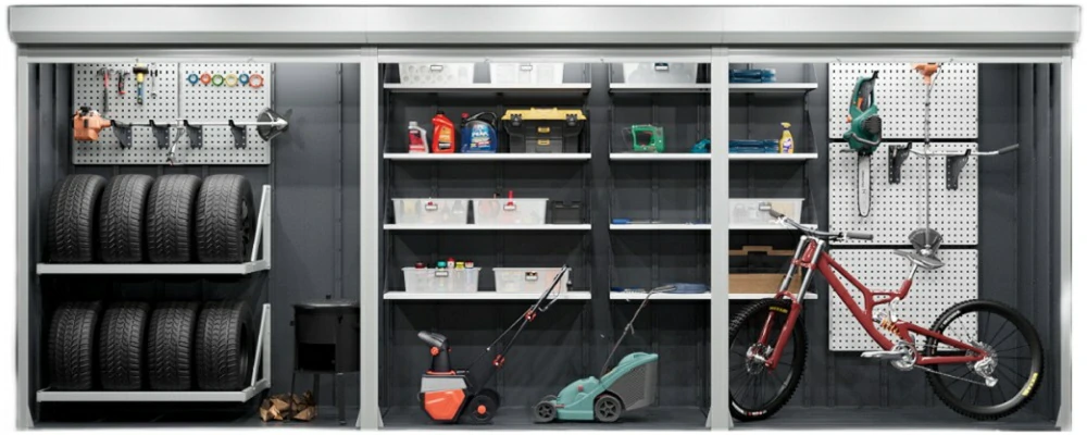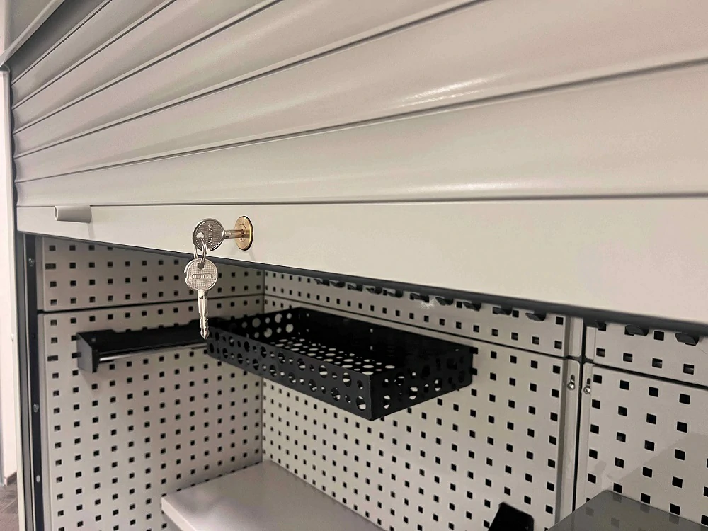 Шкаф представляет собой модульную систему хранения с тремя независимыми роллетными блоками.