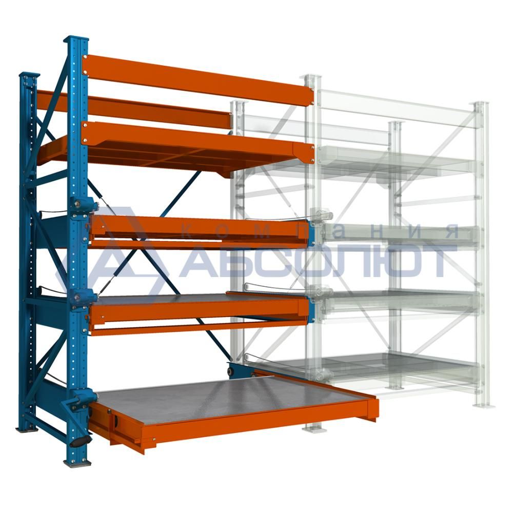 Дополнительная секция стеллажа с выкатными платформами полного выдвижения Slide 1400, 800*1205, с механическим приводом полки предназначена для хранения тяжелой оснастки (штампы, формы для литья и т.п.)