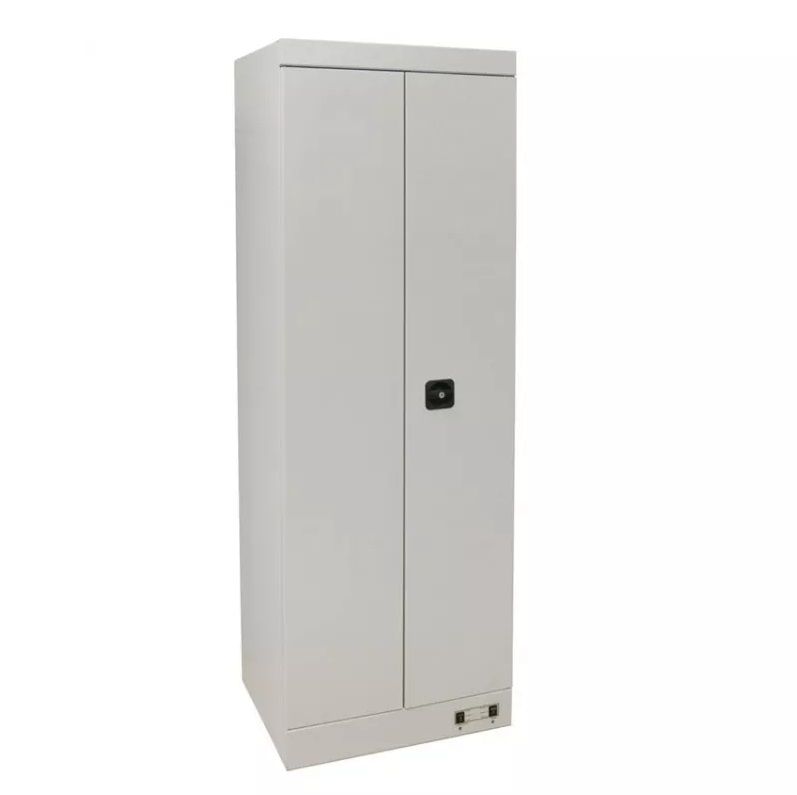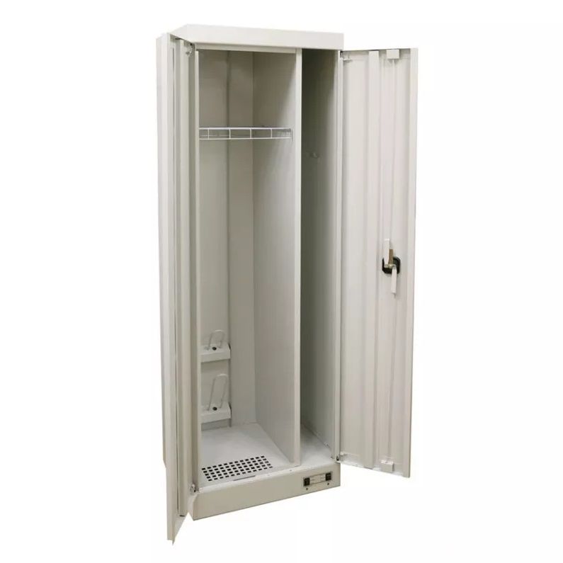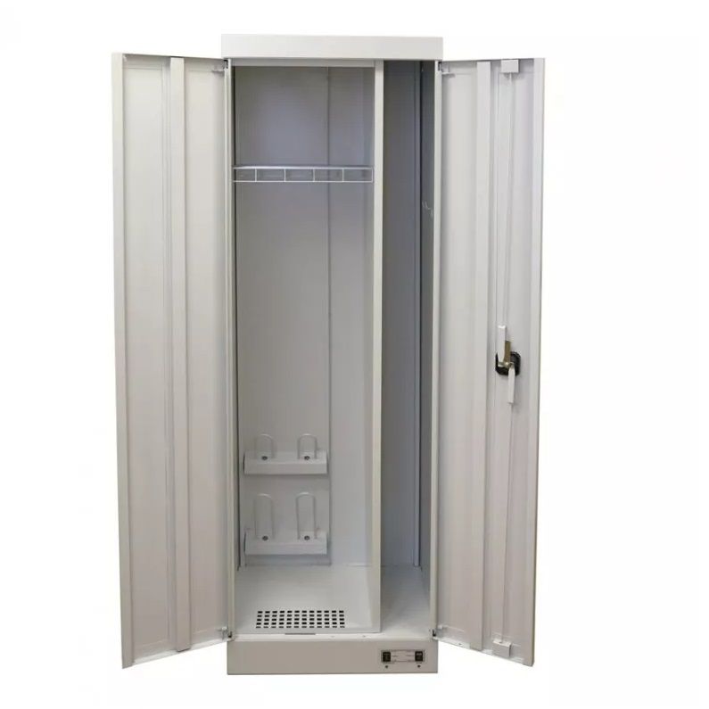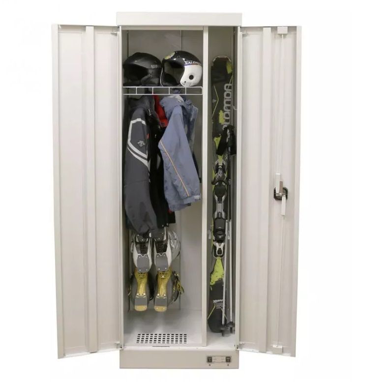 - верхняя часть корпуса разделена глухой перегородкой на отделение для сушки одежды и отделение для хранения спортивного инвентаря (например лыж) и закрывается двумя дверьми, в одной из которых установлен ригельный замок, запирающий одновременно обе двери,
