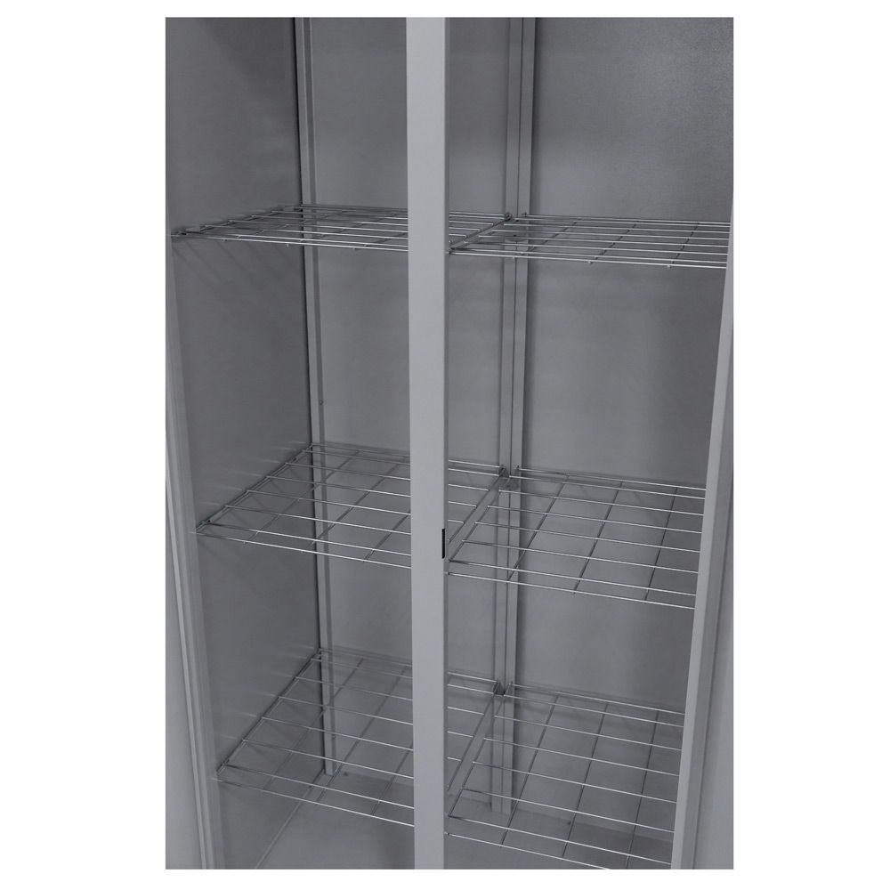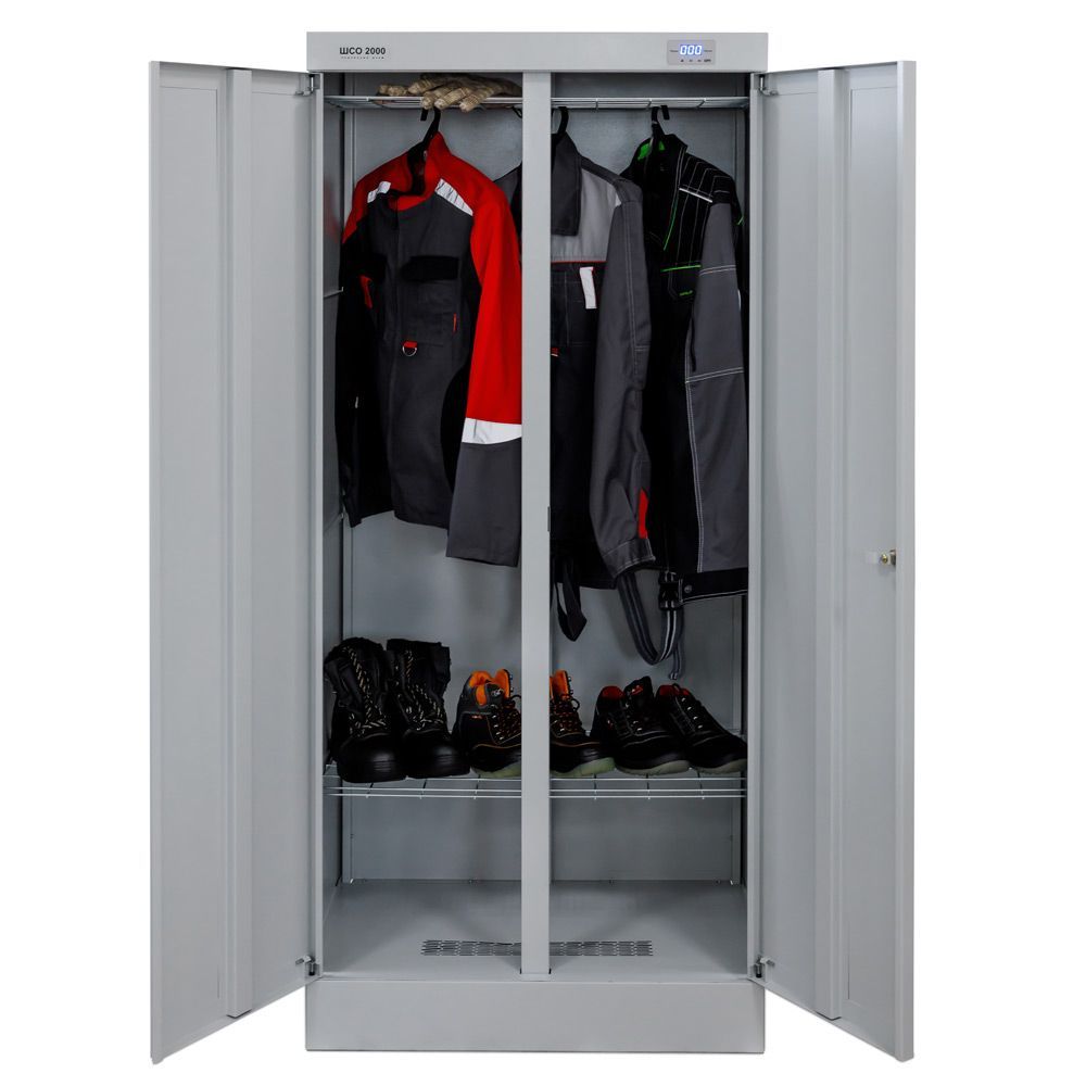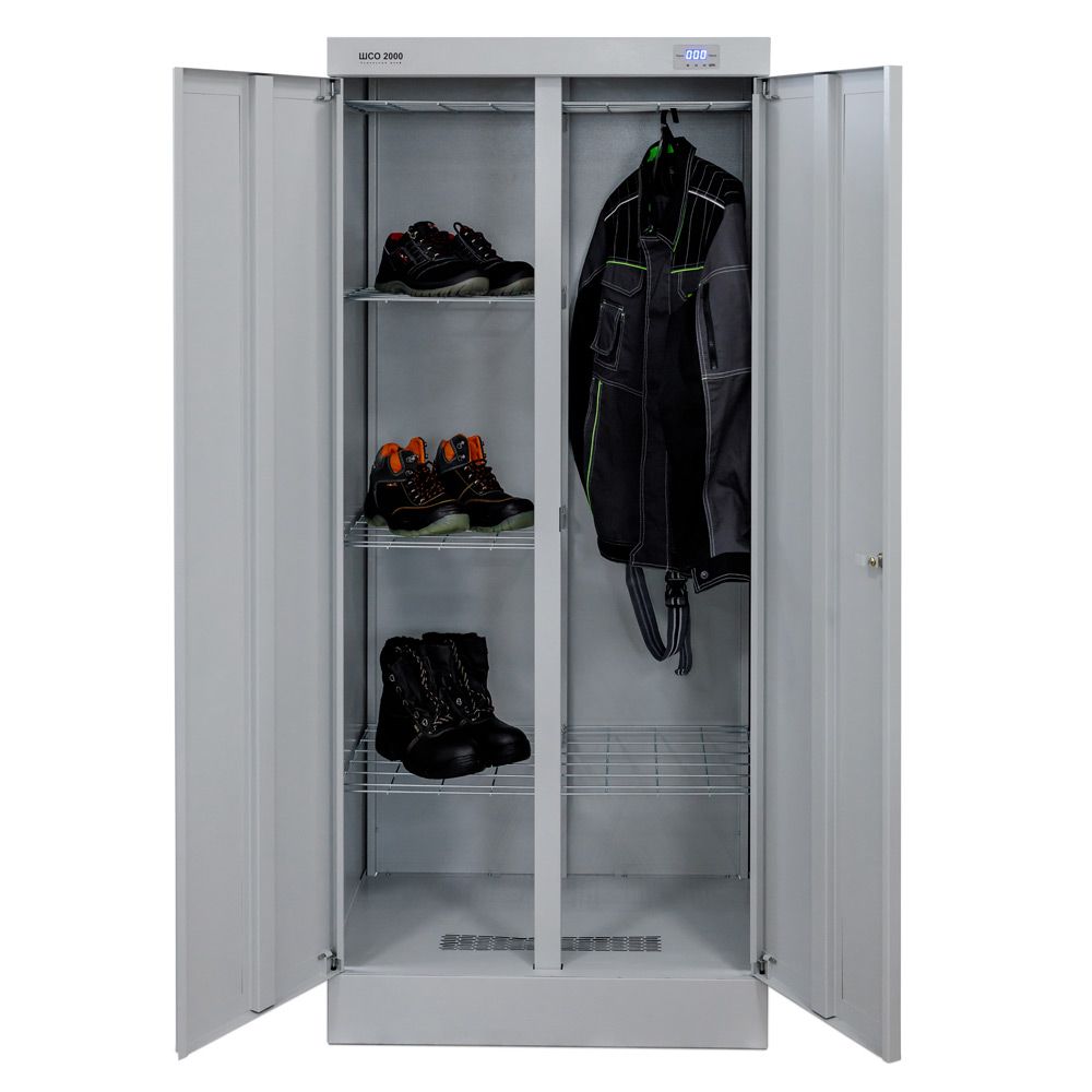 - Верхняя часть корпуса закрывается двумя дверьми, в одной из которых установлен почтовый замок, запирающий одновременно обе двери. Внутри верхняя часть корпуса снабжена шестью съемными сетчатыми полками. На полки можно укладывать для сушки рукавицы, головные уборы или обувь. К сетчатым полкам можно так же подвешивать плечики с одеждой.В крышке шкафа расположено отверстие для выхода воздуха. В комплекте фланец для подключения к внешней системе вентиляции.