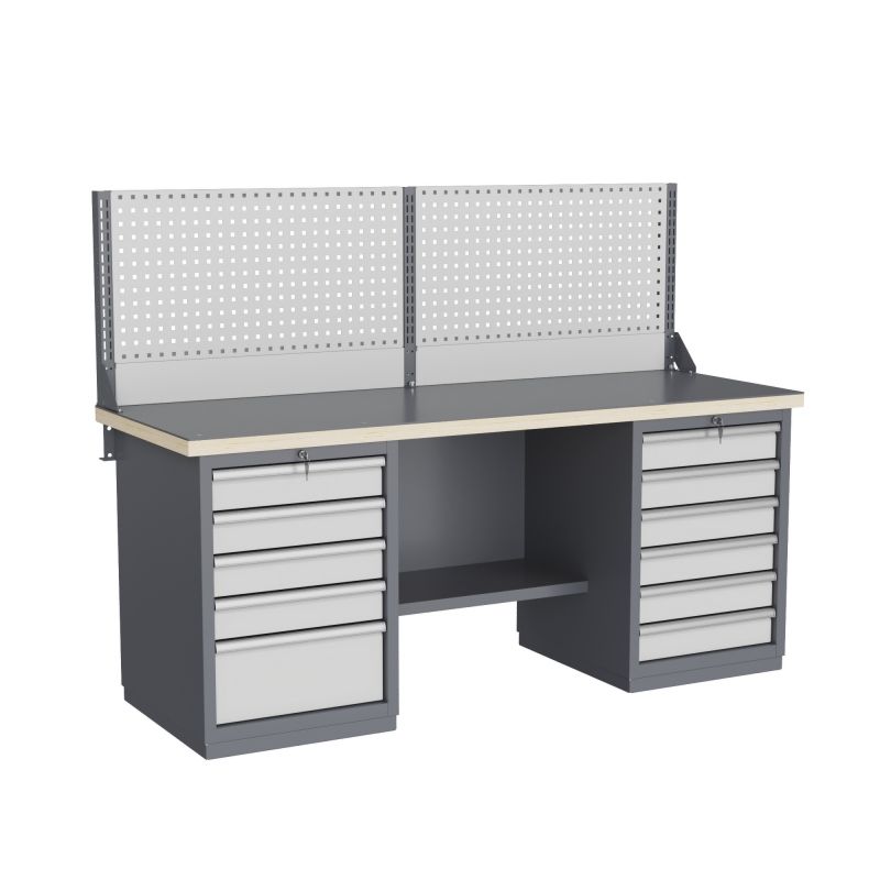 - Верстак может комплектоваться одинарным или двойным перфорированным экраном, электромонтажным блоком для установки розеток и дополнительных устройств, а также комплектом освещения с держателем и лампой. Перфорация экрана подходит под стандартные держатели для инструментов, отверток, крючков, полок. Возможна комплектование верстака навесным элементами (держатели, крючки, полки)