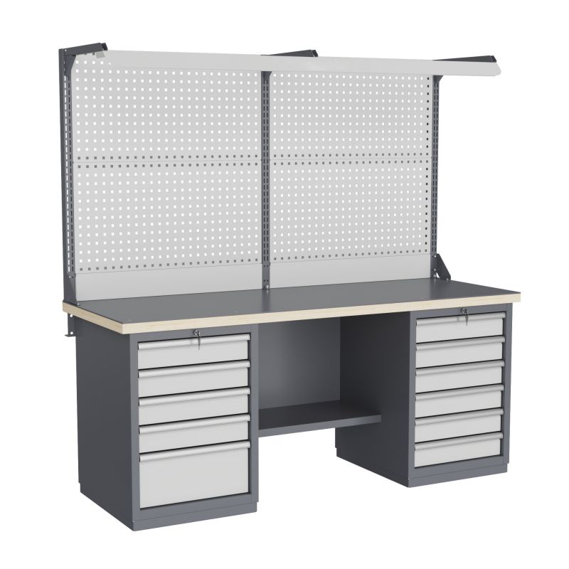 - Верстак может комплектоваться одинарным или двойным перфорированным экраном, электромонтажным блоком для установки розеток и дополнительных устройств, а также комплектом освещения с держателем и лампой. Перфорация экрана подходит под стандартные держатели для инструментов, отверток, крючков, полок. Возможна комплектование верстака навесным элементами (держатели, крючки, полки)
