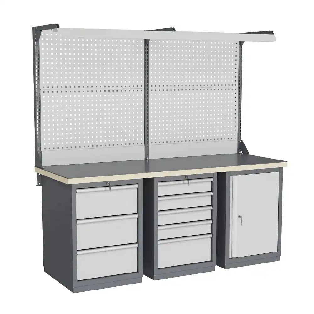 - Верстак может комплектоваться одинарным или двойным перфорированным экраном, электромонтажным блоком для установки розеток и дополнительных устройств, а также комплектом освещения с держателем и лампой. Перфорация экрана подходит под стандартные держатели для инструментов, отверток, крючков, полок. Возможна комплектование верстака навесным элементами (держатели, крючки, полки). Кронштейны экранов соединены со столешницей через заднюю балку верстаков