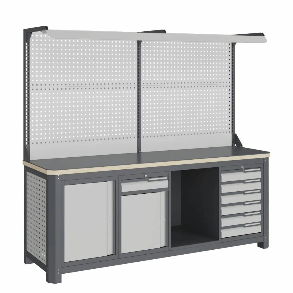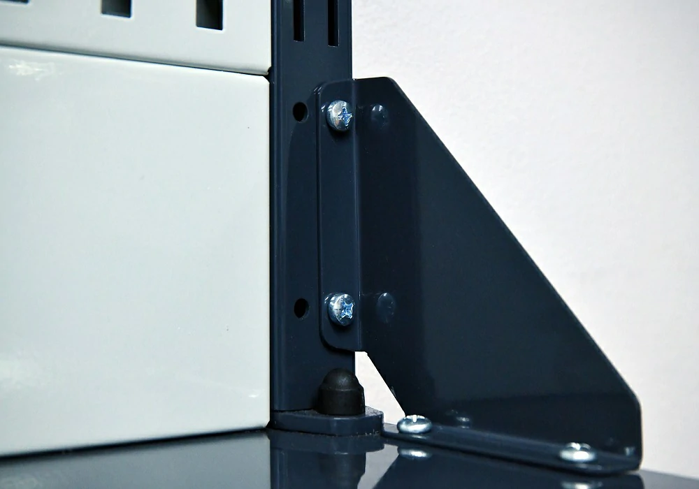- Экран (перфорированная панель) верстака выполнен с квадратной перфорацией 12х12 мм с шагом 38 мм для установки крючков, держателей и других аксессуаров. Экран крепятся к столешнице с помощью специальных кронштейнов. Максимальная масса груза, равномерно распределенного по поверхности экрана, составляет 71 кг.