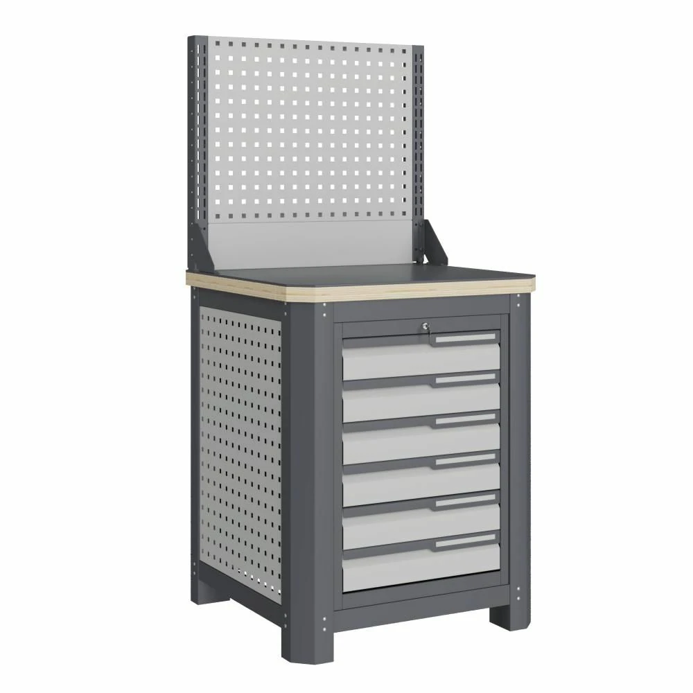 - Экран (перфорированная панель) верстака выполнен с квадратной перфорацией 12х12 мм с шагом 38 мм для установки крючков, держателей и других аксессуаров. Экран крепятся к столешнице с помощью специальных кронштейнов. Максимальная масса груза, равномерно распределенного по поверхности экрана, составляет 71 кг.