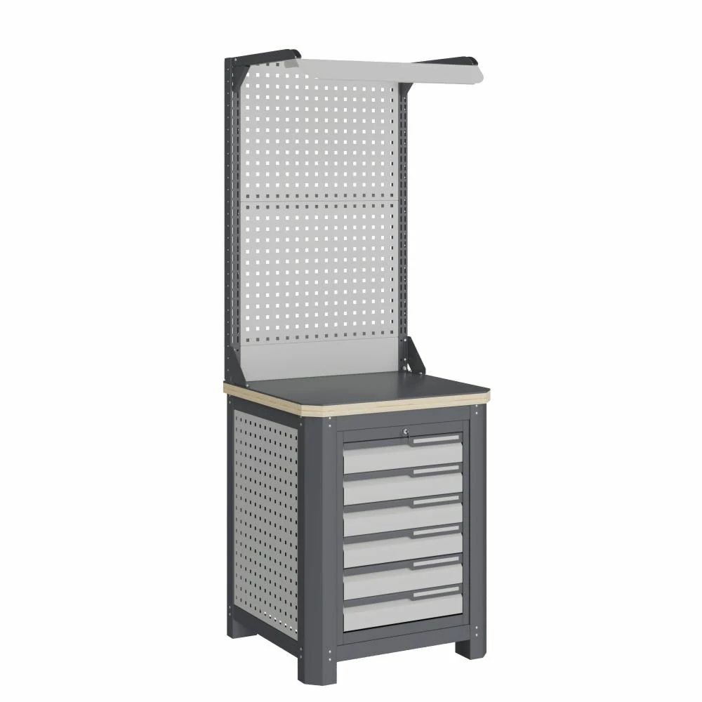 - Экран (перфорированная панель) верстака выполнен с квадратной перфорацией 12х12 мм с шагом 38 мм для установки крючков, держателей и других аксессуаров. Экран крепятся к столешнице с помощью специальных кронштейнов. Максимальная масса груза, равномерно распределенного по поверхности экрана, составляет 71 кг.