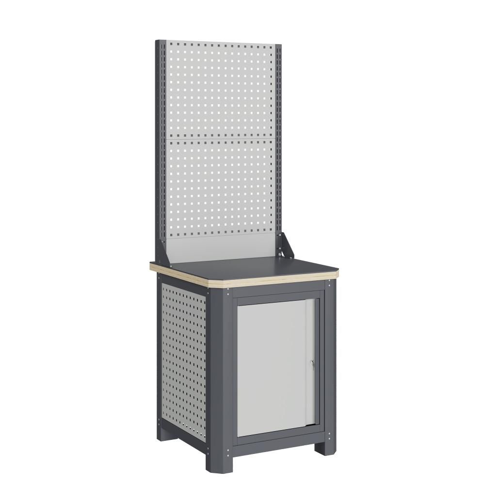 - Экран (перфорированная панель) верстака выполнен с квадратной перфорацией 12х12 мм с шагом 38 мм для установки крючков, держателей и других аксессуаров. Экран крепятся к столешнице с помощью специальных кронштейнов. Максимальная масса груза, равномерно распределенного по поверхности экрана, составляет 71 кг.