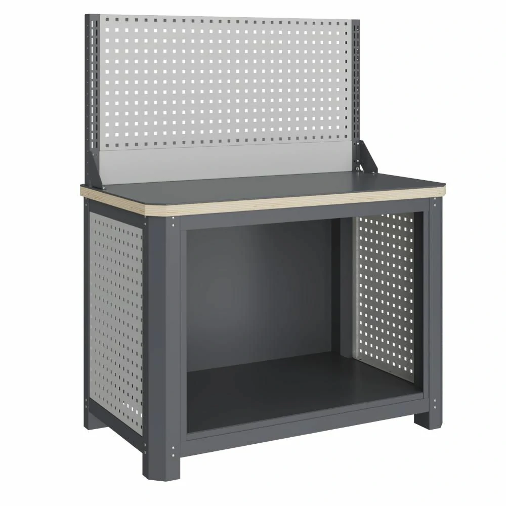 - Экран (перфорированная панель) и боковые элементы верстака выполнены с квадратной перфорацией 12х12 мм с шагом 38 мм для установки крючков, держателей и других аксессуаров. Экран крепятся к столешнице с помощью специальных кронштейнов. Максимальная масса груза, равномерно распределенного по поверхности экрана, составляет 71 кг.