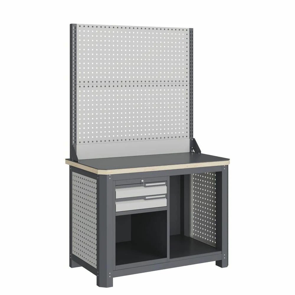 - Экран (перфорированная панель) и боковые элементы верстака выполнен с квадратной перфорацией 12х12 мм с шагом 38 мм для установки крючков, держателей и других аксессуаров. Экран крепятся к столешнице с помощью специальных кронштейнов. Максимальная масса груза, равномерно распределенного по поверхности экрана, составляет 71 кг.