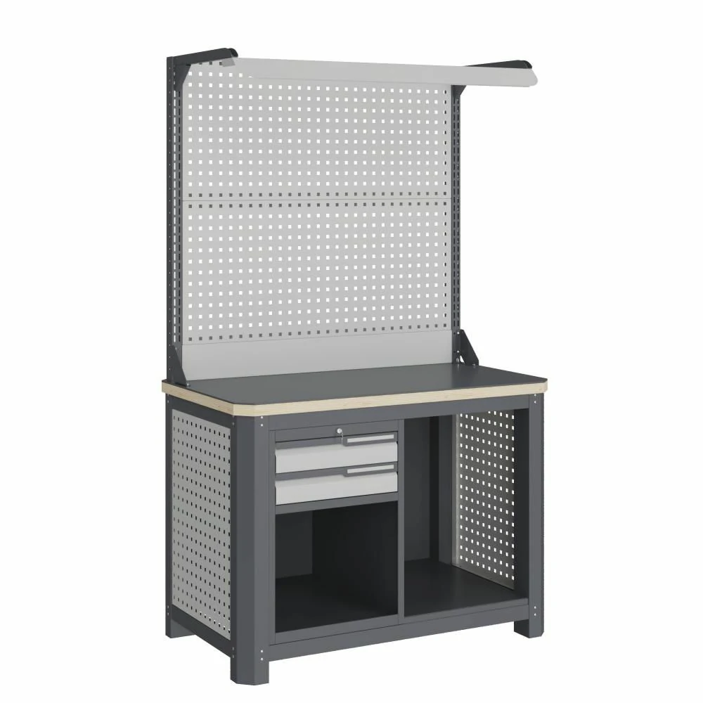 - Экран (перфорированная панель) и боковые элементы верстака выполнен с квадратной перфорацией 12х12 мм с шагом 38 мм для установки крючков, держателей и других аксессуаров. Экран крепятся к столешнице с помощью специальных кронштейнов. Максимальная масса груза, равномерно распределенного по поверхности экрана, составляет 71 кг.
