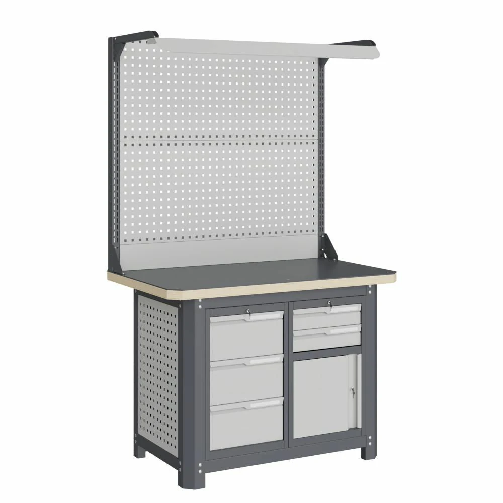 - Экран (перфорированная панель) и боковые элементы верстака выполнены с квадратной перфорацией 12х12 мм с шагом 38 мм для установки крючков, держателей и других аксессуаров. Экран крепятся к столешнице с помощью специальных кронштейнов. Максимальная масса груза, равномерно распределенного по поверхности экрана, составляет 71 кг.