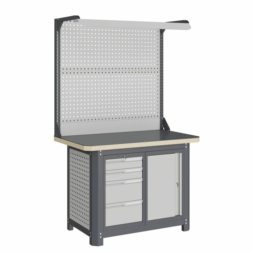 - Экран (перфорированная панель) и боковые элементы верстака выполнены с квадратной перфорацией 12х12 мм с шагом 38 мм для установки крючков, держателей и других аксессуаров. Экран крепятся к столешнице с помощью специальных кронштейнов. Максимальная масса груза, равномерно распределенного по поверхности экрана, составляет 71 кг.