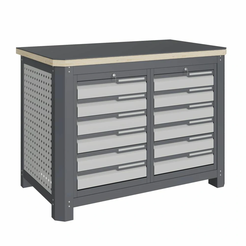 - Рабочее место MECHANIC: MCN 1252.S66 состоит из столешницы шириной 1193 мм, рамы верстака, состоящей из опор, перемычек, боковых перфопанелей, двух небольших модулей с ящиками S6.
