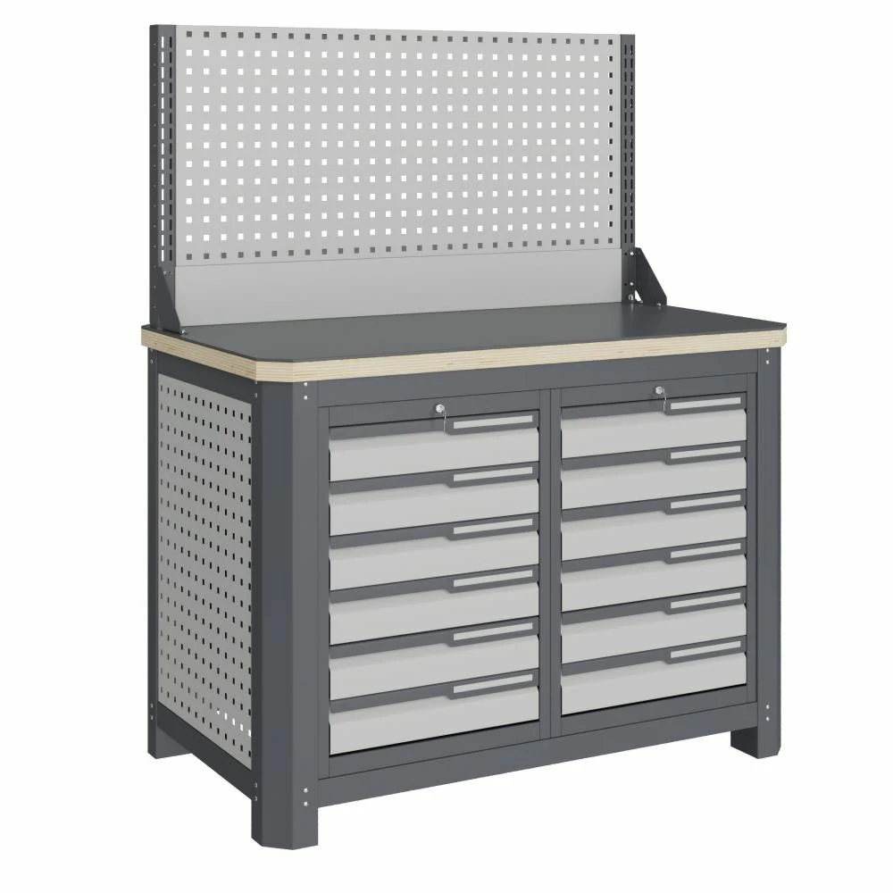 - Рабочее место MECHANIC: MCN 1252.S66 состоит из столешницы шириной 1193 мм, рамы верстака, состоящей из опор, перемычек, боковых перфопанелей, двух небольших модулей с ящиками S6.