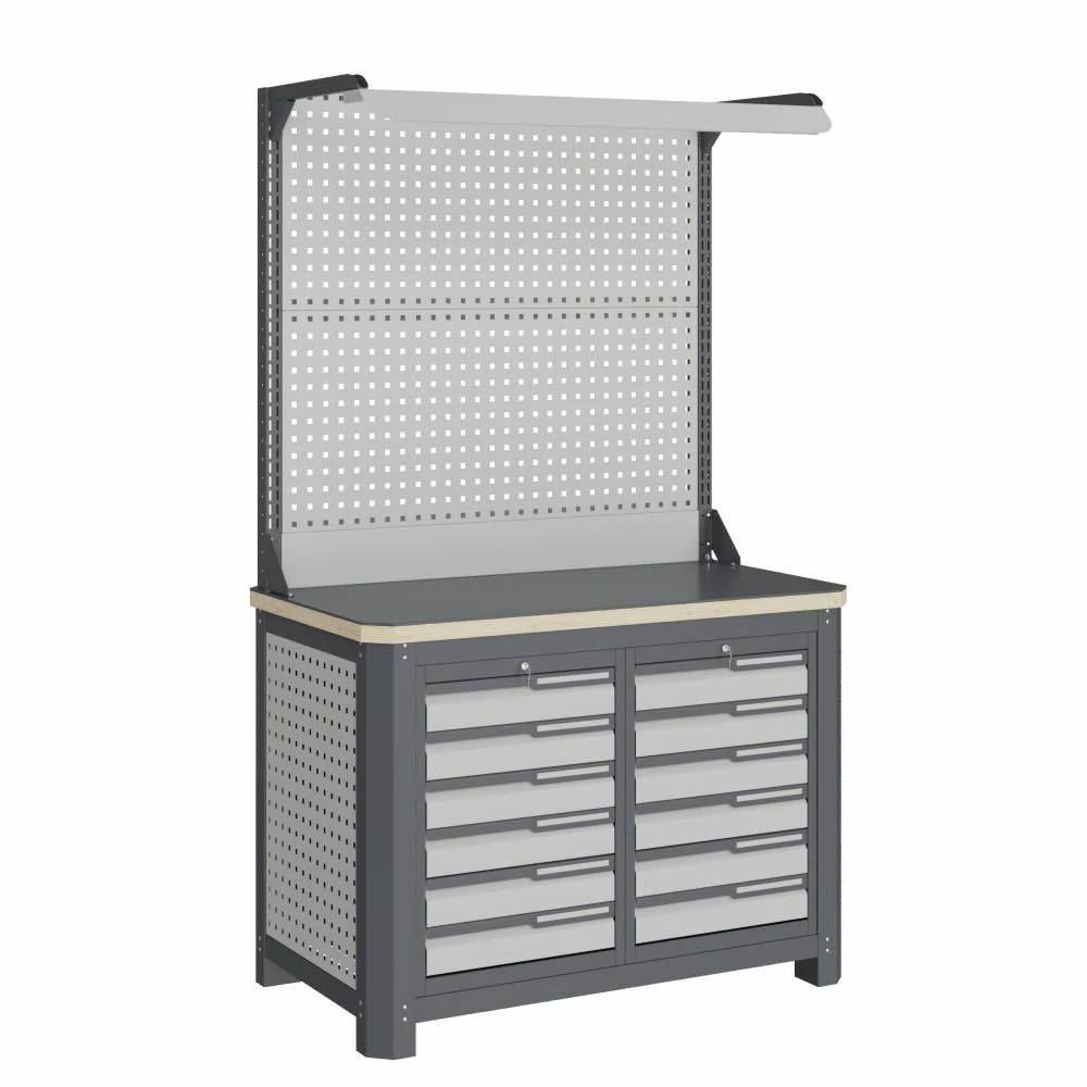 - Рабочее место MECHANIC: MCN 1252.S66 состоит из столешницы шириной 1193 мм, рамы верстака, состоящей из опор, перемычек, боковых перфопанелей, двух небольших модулей с ящиками S6.