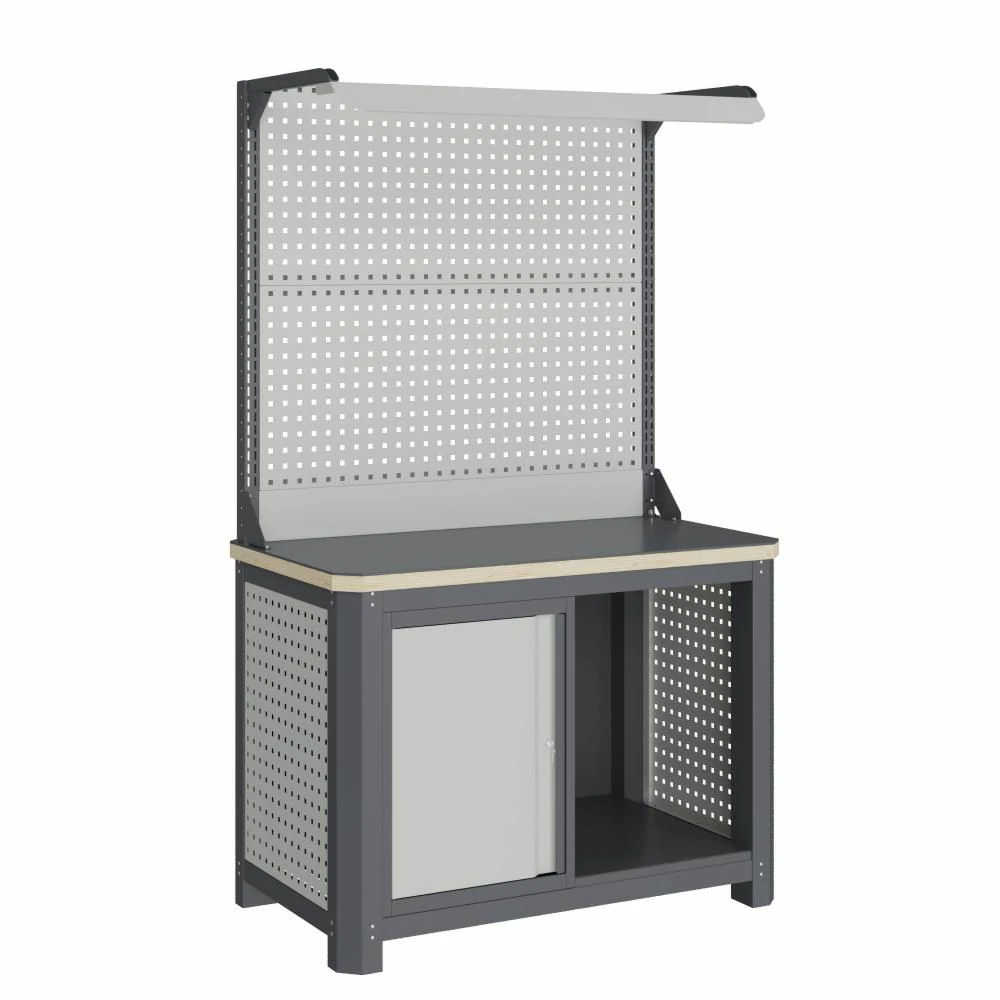 - Экран (перфорированная панель) и боковые элементы верстака выполнены с квадратной перфорацией 12х12 мм с шагом 38 мм для установки крючков, держателей и других аксессуаров. Экран крепятся к столешнице с помощью специальных кронштейнов. Максимальная масса груза, равномерно распределенного по поверхности экрана, составляет 71 кг.