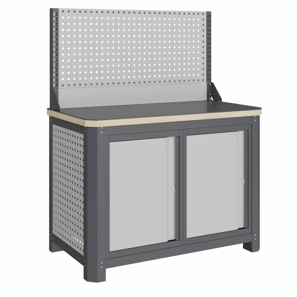- Экран (перфорированная панель) и боковые элементы верстака выполнены с квадратной перфорацией 12х12 мм с шагом 38 мм для установки крючков, держателей и других аксессуаров. Экран крепятся к столешнице с помощью специальных кронштейнов. Максимальная масса груза, равномерно распределенного по поверхности экрана, составляет 71 кг.