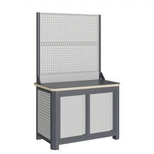 - Экран (перфорированная панель) и боковые элементы верстака выполнены с квадратной перфорацией 12х12 мм с шагом 38 мм для установки крючков, держателей и других аксессуаров. Экран крепятся к столешнице с помощью специальных кронштейнов. Максимальная масса груза, равномерно распределенного по поверхности экрана, составляет 71 кг.