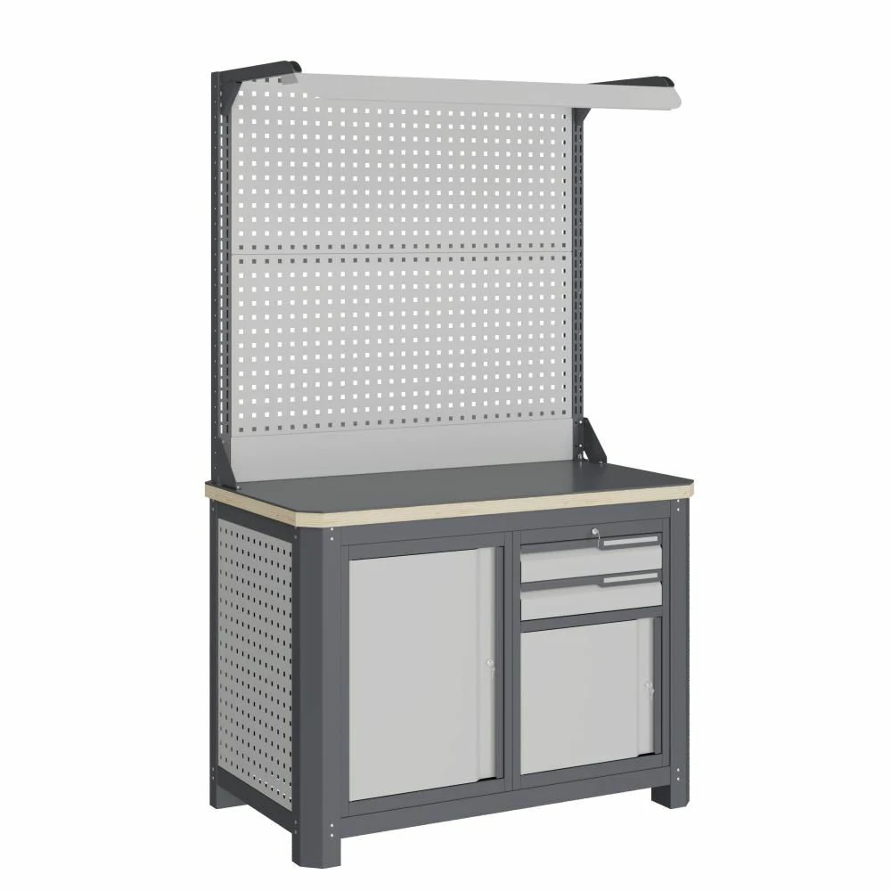 - Экран (перфорированная панель) и боковые элементы верстака выполнены с квадратной перфорацией 12х12 мм с шагом 38 мм для установки крючков, держателей и других аксессуаров. Экран крепятся к столешнице с помощью специальных кронштейнов. Максимальная масса груза, равномерно распределенного по поверхности экрана, составляет 71 кг.