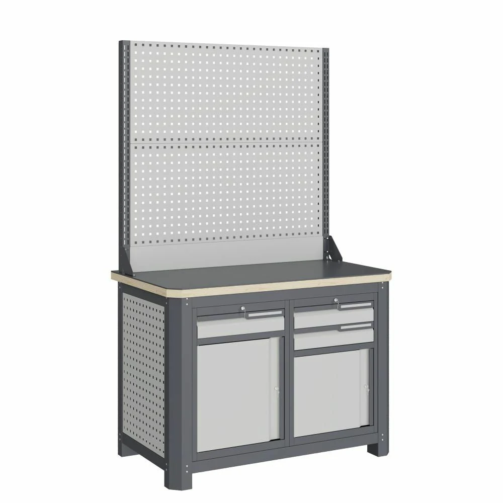 - Экран (перфорированная панель) боковые элементы верстака выполнены с квадратной перфорацией 12х12 мм с шагом 38 мм для установки крючков, держателей и других аксессуаров. Экран крепятся к столешнице с помощью специальных кронштейнов. Максимальная масса груза, равномерно распределенного по поверхности экрана, составляет 71 кг.