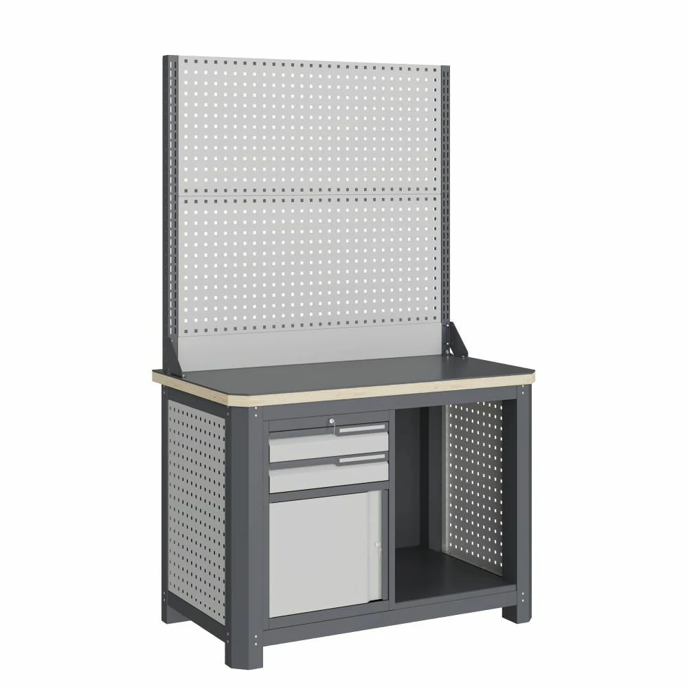 - Экран (перфорированная панель) и боковые элементы верстака выполнены с квадратной перфорацией 12х12 мм с шагом 38 мм для установки крючков, держателей и других аксессуаров. Экран крепятся к столешнице с помощью специальных кронштейнов. Максимальная масса груза, равномерно распределенного по поверхности экрана, составляет 71 кг.