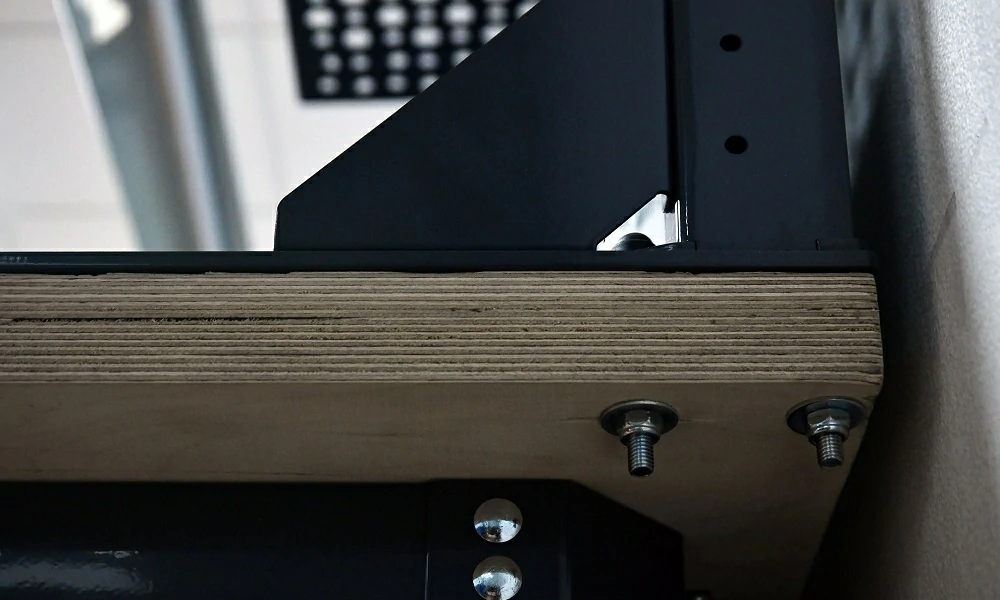 - Экран (перфорированная панель) и боковые элементы верстака выполнены с квадратной перфорацией 12х12 мм с шагом 38 мм для установки крючков, держателей и других аксессуаров. Экран крепятся к столешнице с помощью специальных кронштейнов. Максимальная масса груза, равномерно распределенного по поверхности экрана, составляет 71 кг.