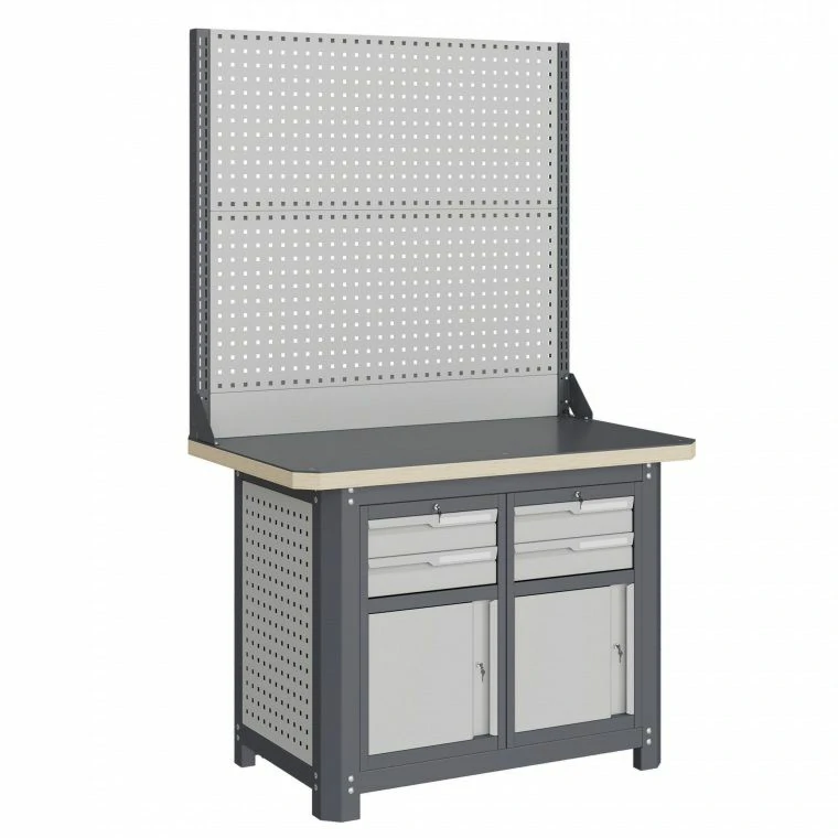 - Экран (перфорированная панель) и боковые элементы верстака выполнены с квадратной перфорацией 12х12 мм с шагом 38 мм для установки крючков, держателей и других аксессуаров. Экран крепятся к столешнице с помощью специальных кронштейнов. Максимальная масса груза, равномерно распределенного по поверхности экрана, составляет 71 кг.