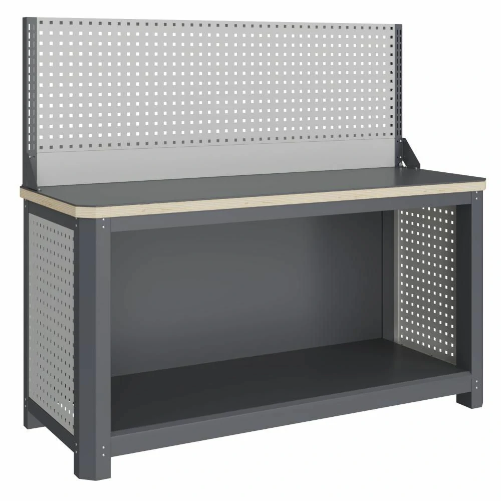 - Экран (перфорированная панель)и боковые элементы верстака выполнены с квадратной перфорацией 12х12 мм с шагом 38 мм для установки крючков, держателей и других аксессуаров. Экран крепятся к столешнице с помощью специальных кронштейнов. Максимальная масса груза, равномерно распределенного по поверхности экрана, составляет 71 кг.
