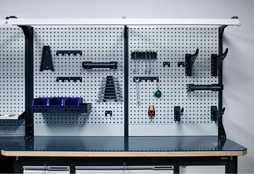 - Экран (перфорированная панель) и боковые элементы верстака выполнены с квадратной перфорацией 12х12 мм с шагом 38 мм для установки крючков, держателей и других аксессуаров. Экран крепятся к столешнице с помощью специальных кронштейнов. Максимальная масса груза, равномерно распределенного по поверхности экрана, составляет 71 кг.