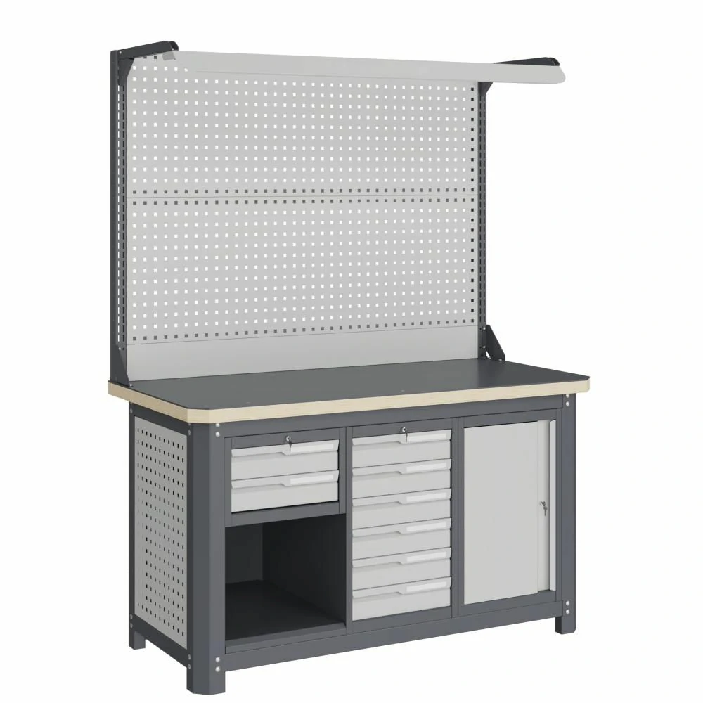 - Экран (перфорированная панель) и боковые элементы верстака выполнены с квадратной перфорацией 12х12 мм с шагом 38 мм для установки крючков, держателей и других аксессуаров. Экран крепятся к столешнице с помощью специальных кронштейнов. Максимальная масса груза, равномерно распределенного по поверхности экрана, составляет 71 кг.