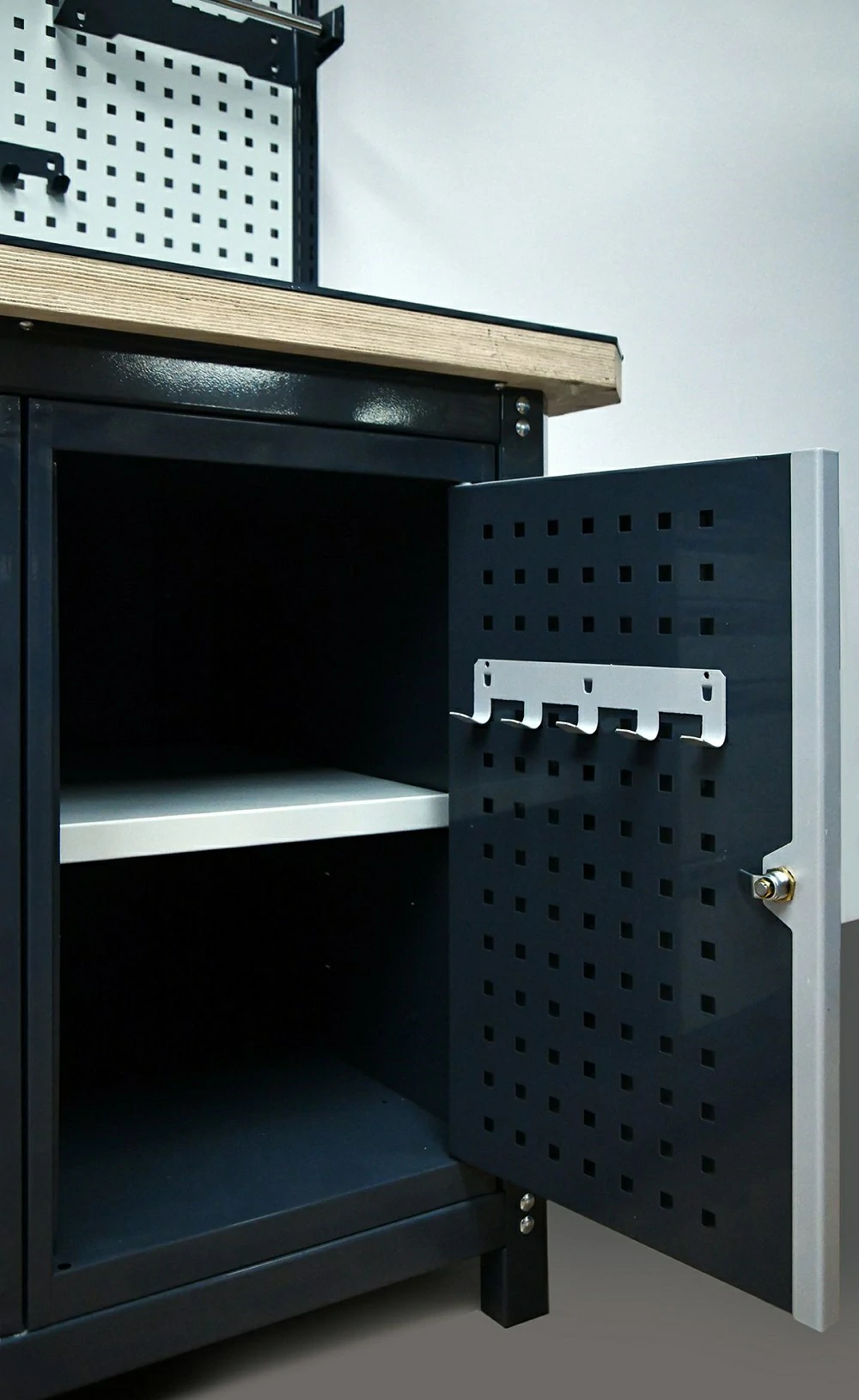 - Квадратная перфорация на элементах верстака предназначена для установки крючков, держателей и других аксессуаров, имеет размеры: квадрат 12х12 мм, с шагом 38 мм.