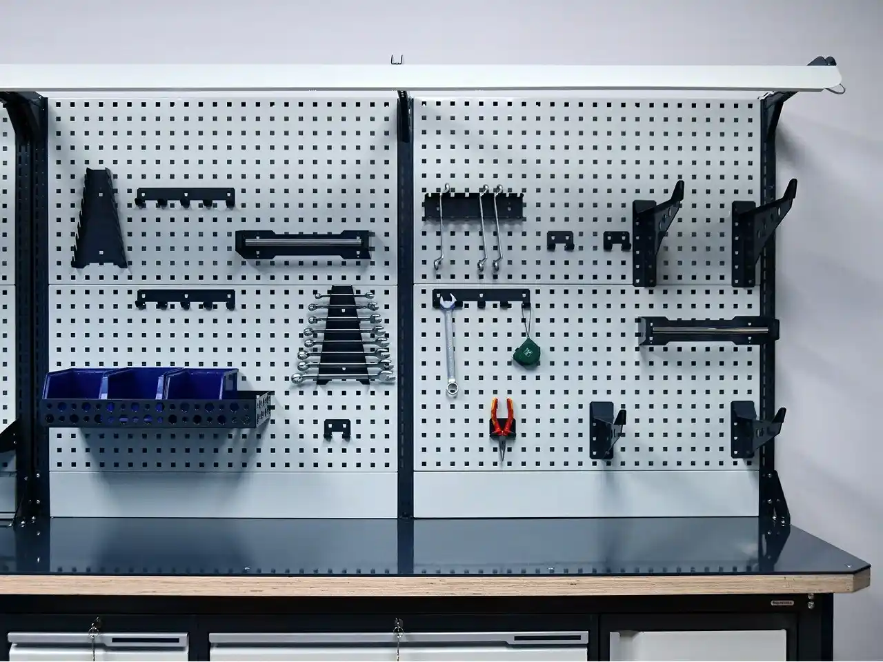 - Экран (перфорированная панель) и боковые элементы верстака выполнены с квадратной перфорацией 12х12 мм с шагом 38 мм для установки крючков, держателей и других аксессуаров. Экран крепятся к столешнице с помощью специальных кронштейнов.