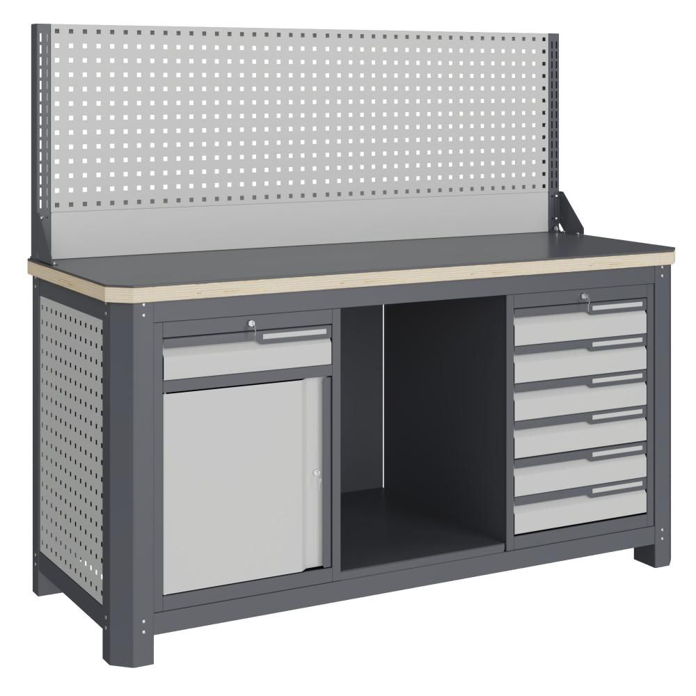 - Экран (перфорированная панель) и боковые элементы верстака выполнены с квадратной перфорацией 12х12 мм с шагом 38 мм для установки крючков, держателей и других аксессуаров. Экран крепятся к столешнице с помощью специальных кронштейнов. Максимальная масса груза, равномерно распределенного по поверхности экрана, составляет 71 кг.