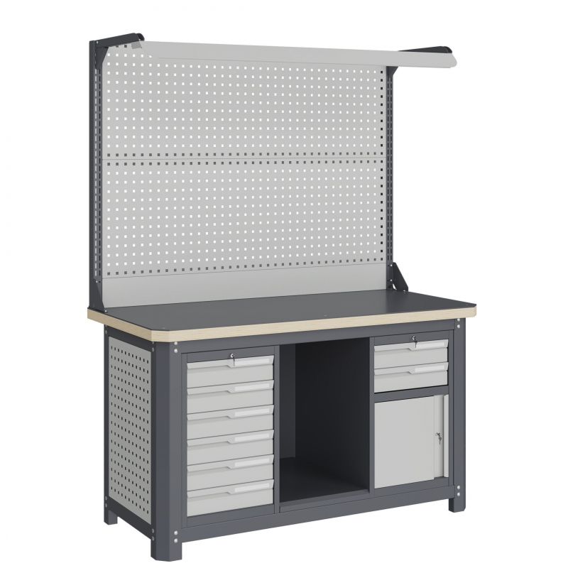 - Экран (перфорированная панель) и боковые элементы верстака выполнены с квадратной перфорацией 12х12 мм с шагом 38 мм для установки крючков, держателей и других аксессуаров. Экран крепятся к столешнице с помощью специальных кронштейнов. Максимальная масса груза, равномерно распределенного по поверхности экрана, составляет 71 кг.