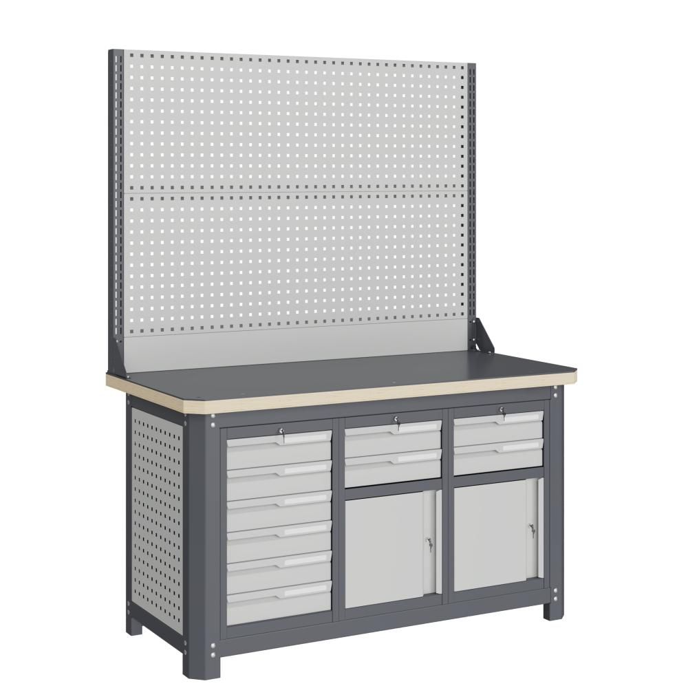 - Экран (перфорированная панель) и боковые элементы верстака выполнены с квадратной перфорацией 12х12 мм с шагом 38 мм для установки крючков, держателей и других аксессуаров. Экран крепятся к столешнице с помощью специальных кронштейнов. Максимальная масса груза, равномерно распределенного по поверхности экрана, составляет 71 кг.