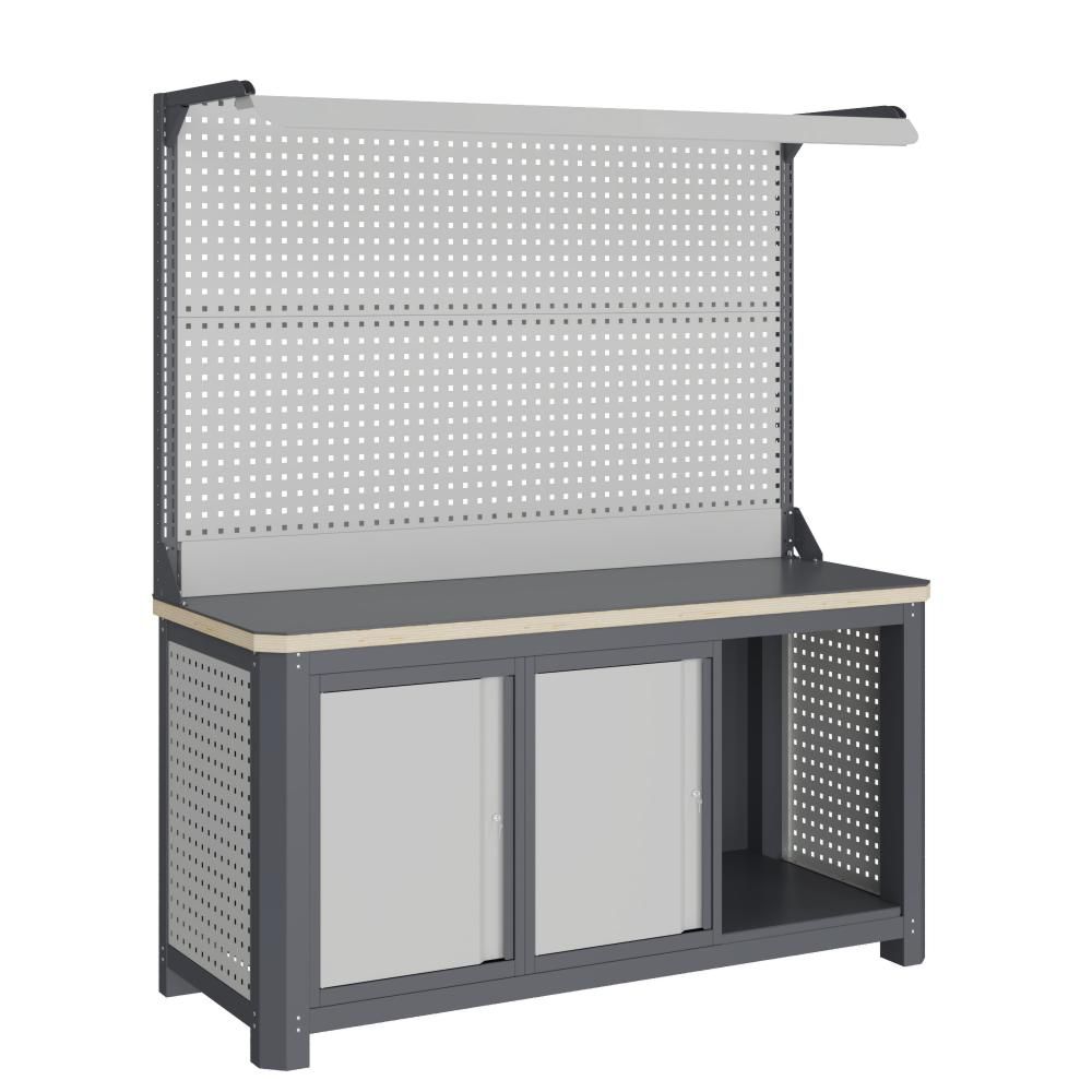 - Экран (перфорированная панель) и боковые элементы верстака выполнены с квадратной перфорацией 12х12 мм с шагом 38 мм для установки крючков, держателей и других аксессуаров. Экран крепятся к столешнице с помощью специальных кронштейнов. Максимальная масса груза, равномерно распределенного по поверхности экрана, составляет 71 кг.