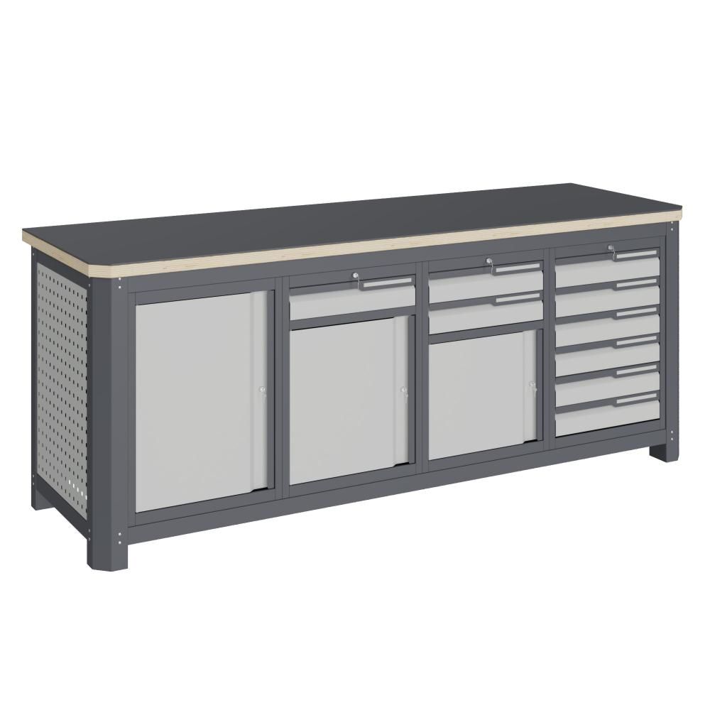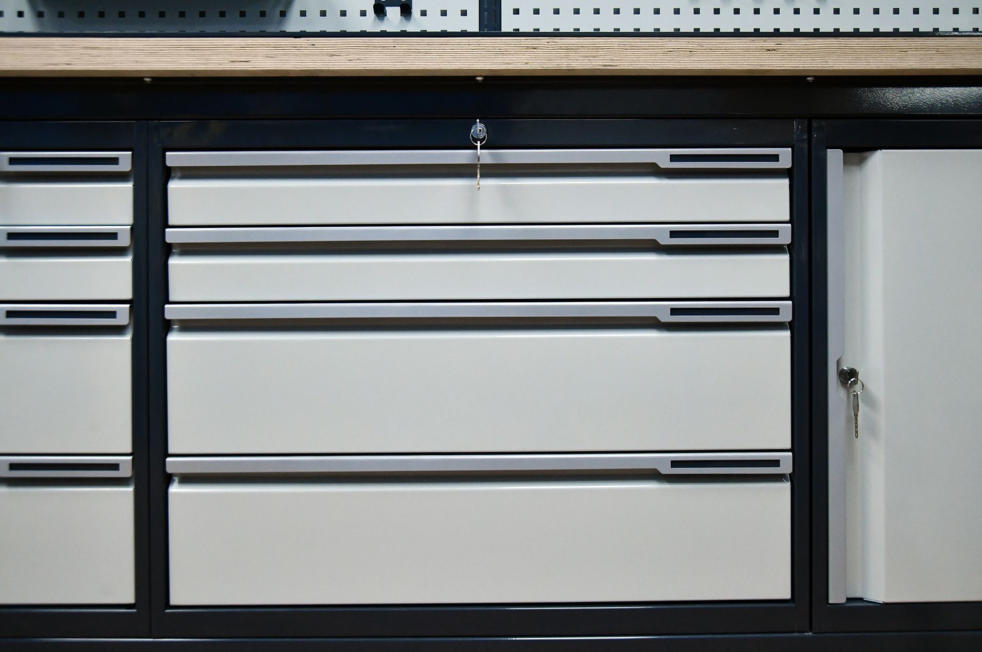 - Модуль верстака выполнен сварными. Ящики в модулях устанавливаются на шариковых телескопических направляющих полного выдвижения.