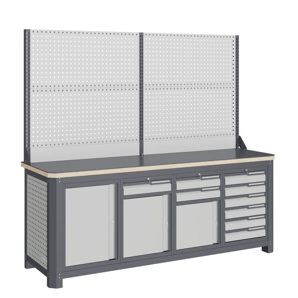 - Экран (перфорированная панель) и боковые элементы верстака выполнены с квадратной перфорацией 12х12 мм с шагом 38 мм для установки крючков, держателей и других аксессуаров. Экран крепятся к столешнице с помощью специальных кронштейнов. Максимальная масса груза, равномерно распределенного по поверхности экрана, составляет 71 кг