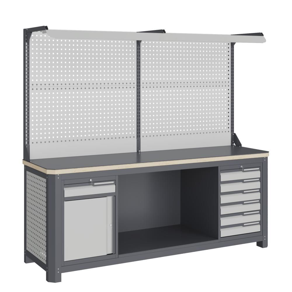 - Экран (перфорированная панель) и боковые элементы верстака выполнены с квадратной перфорацией 12х12 мм с шагом 38 мм для установки крючков, держателей и других аксессуаров. Экран крепятся к столешнице с помощью специальных кронштейнов. Максимальная масса груза, равномерно распределенного по поверхности экрана, составляет 71 кг.