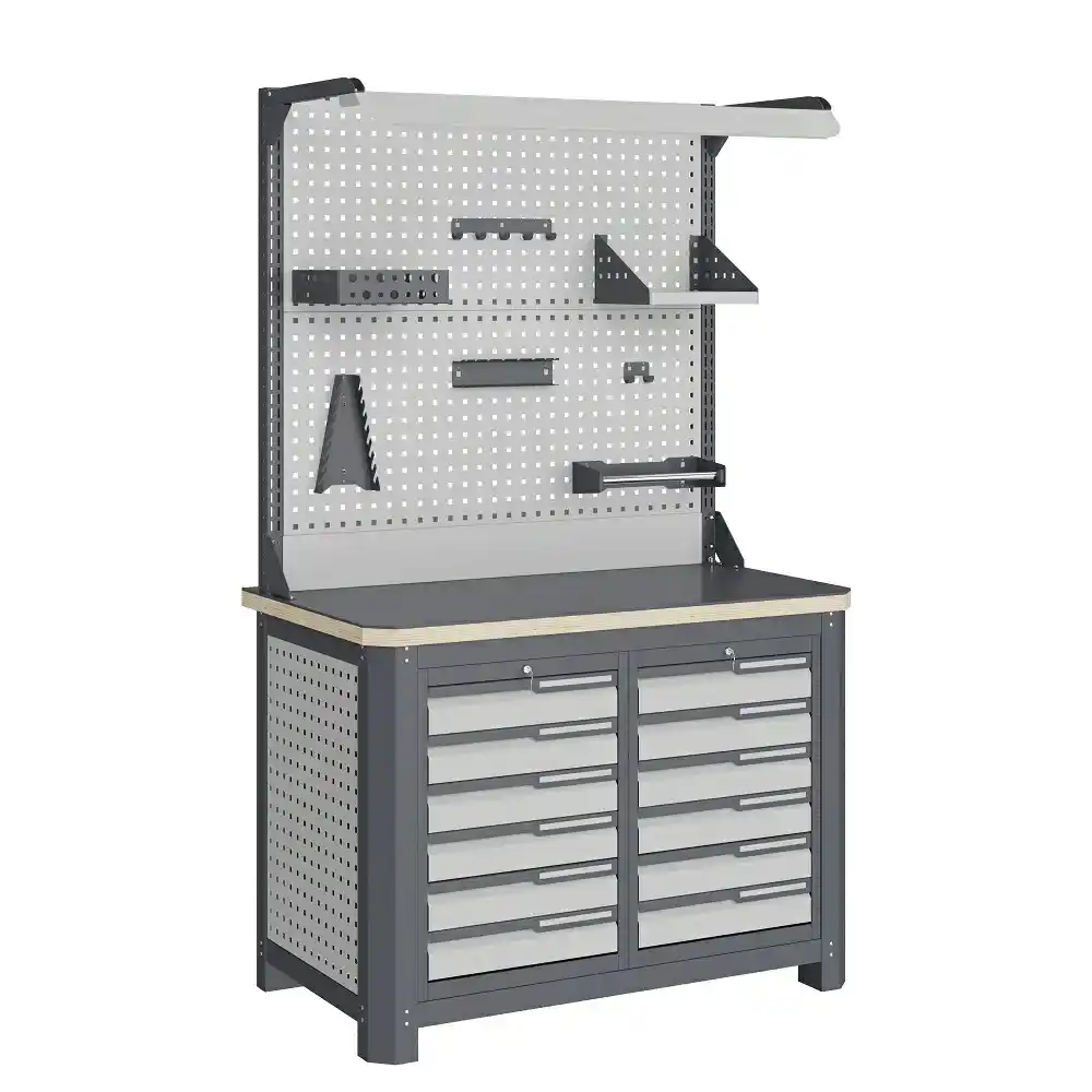 - Экран (перфорированная панель) верстака выполнен с квадратной перфорацией 12х12 мм с шагом 38 мм для установки крючков, держателей и других аксессуаров. Экран крепится к столешнице с помощью специальных кронштейнов. Максимальная масса груза, равномерно распределенного по поверхности экрана, составляет 71 кг.