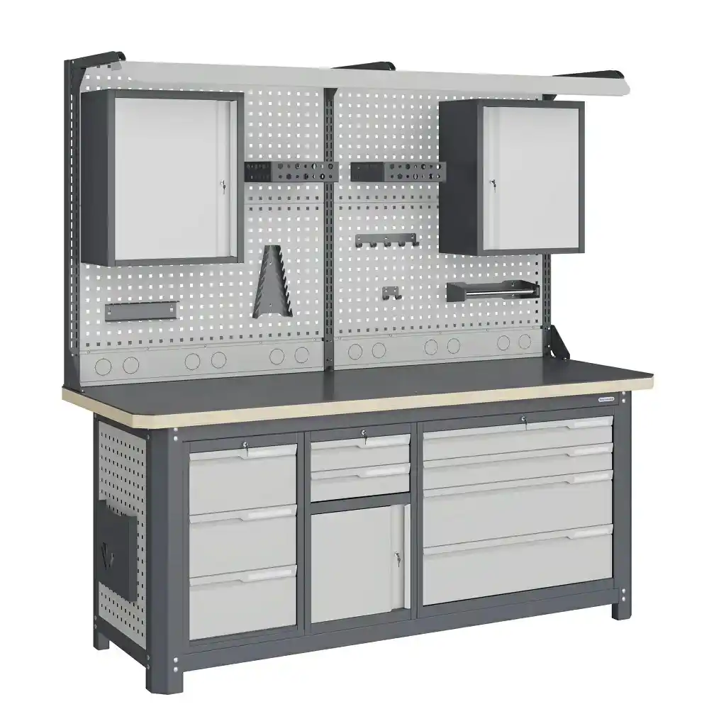 - Экран (перфорированная панель) верстака выполнен с квадратной перфорацией 12х12 мм с шагом 38 мм для установки крючков, держателей и других аксессуаров. Экран крепятся к столешнице с помощью специальных кронштейнов. Максимальная масса груза, равномерно распределенного по поверхности экрана, составляет 71 кг.